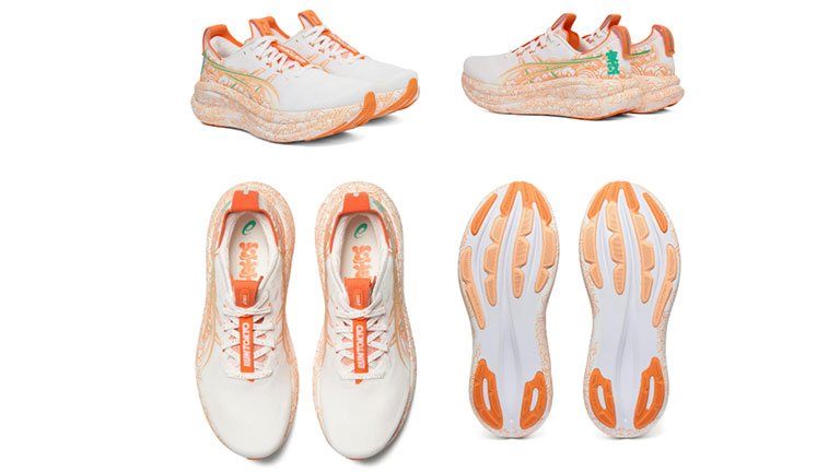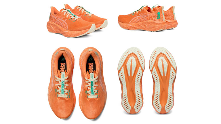 今回、限定モデルとして発売する商品はアシックスブランドを代表するシューズをベースに、“東京マラソン2026”のテーマカラーであるオレンジをアクセントに取り入れています。アッパーやミッドソールには、日本語の『息吹』という言葉に着想を得たグラフィックを、日本の伝統工芸である『型紙』からインスピレーションを受けて大胆に表現しています。また、かかと部と中敷きには『東京』の文字を施しています。